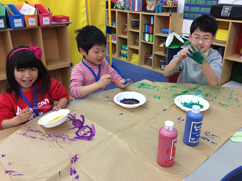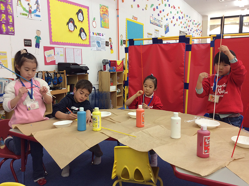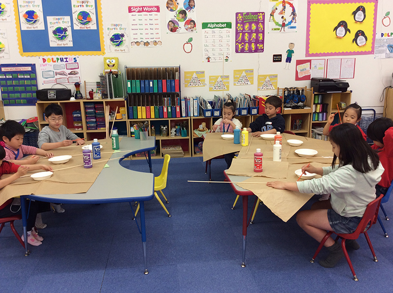 For today’s afternoon game, our elementary class is going to paint long sticks all different colors! There are a lot of sticks to paint, everyone. Work hard!