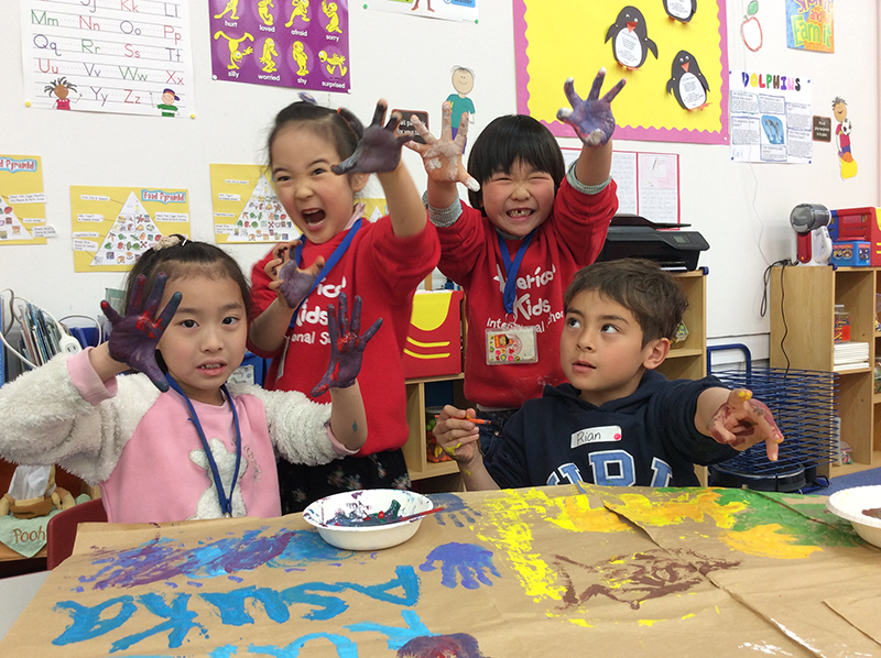 エレメンタリークラスの子達が、午後のゲームに使う長いスティックを、カラフルに塗ってます。